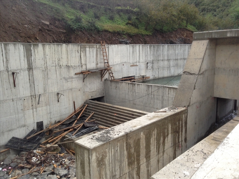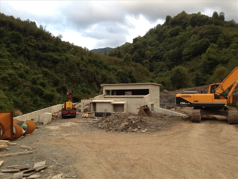 There exists no settling basins for the weir. Diverted creek flow is transferred to underground headpond by buried corrugated pipelines. The 700 mm diameter 1200 m length penstock is also buried. There exists a four jet vertical Pelton turbine inside power house.