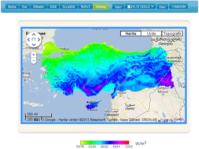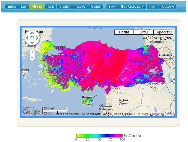 Shortly named as UTUVA (Satellite Based National Data Archive), the project produces maps of hydrology, agriculture, transport, energy, tourism, meteorology and such maps that several disciplines require as; cloud, snow covered area, albedo, vegetation index, snow water equivalent, sun radiation and surface temperature are produced daily and real-time and data starting from the year 2000 are archived.