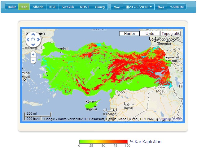 Kısaca UTUVA ismini verdiğimiz “Uydu Tabanlı Ulusal Veri Arşivi” projesi ile hidroloji, tarım, ulaşım, enerji, turizm, meteoroloji vb. gibi birçok disiplinin ihtiyacı olan bulut, karla kaplı alan, albedo, bitki indeksi, kar suyu eşdeğeri, güneş radyasyonu ve yüzey sıcaklığı haritaları gerçek zamanlı ve günlük olarak üretilmekte, 2000 yılından günümüze kadar olan veriler de arşivlenmektedir.